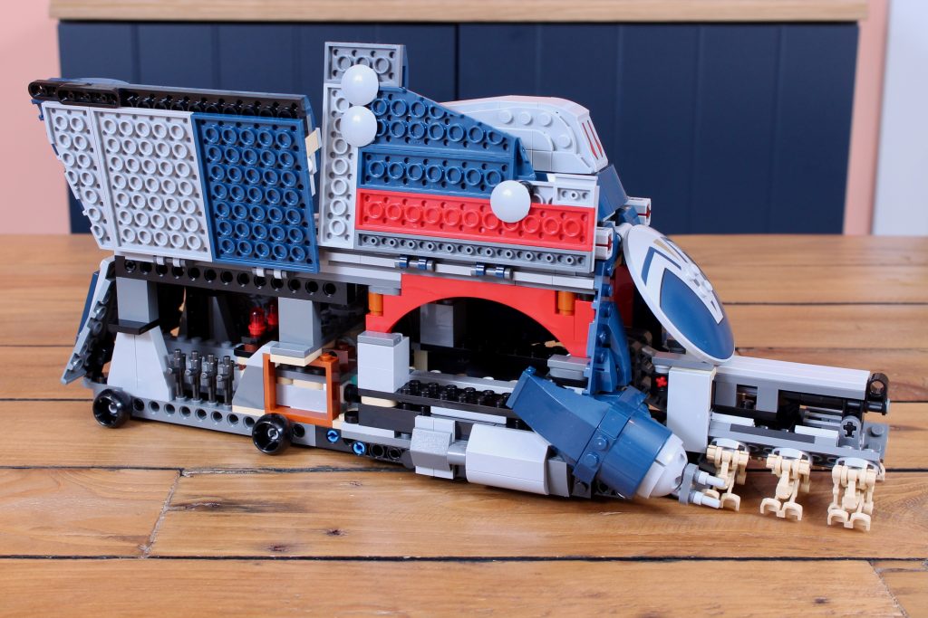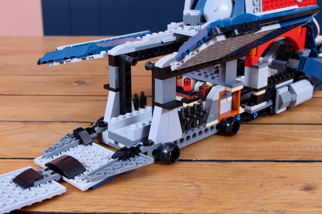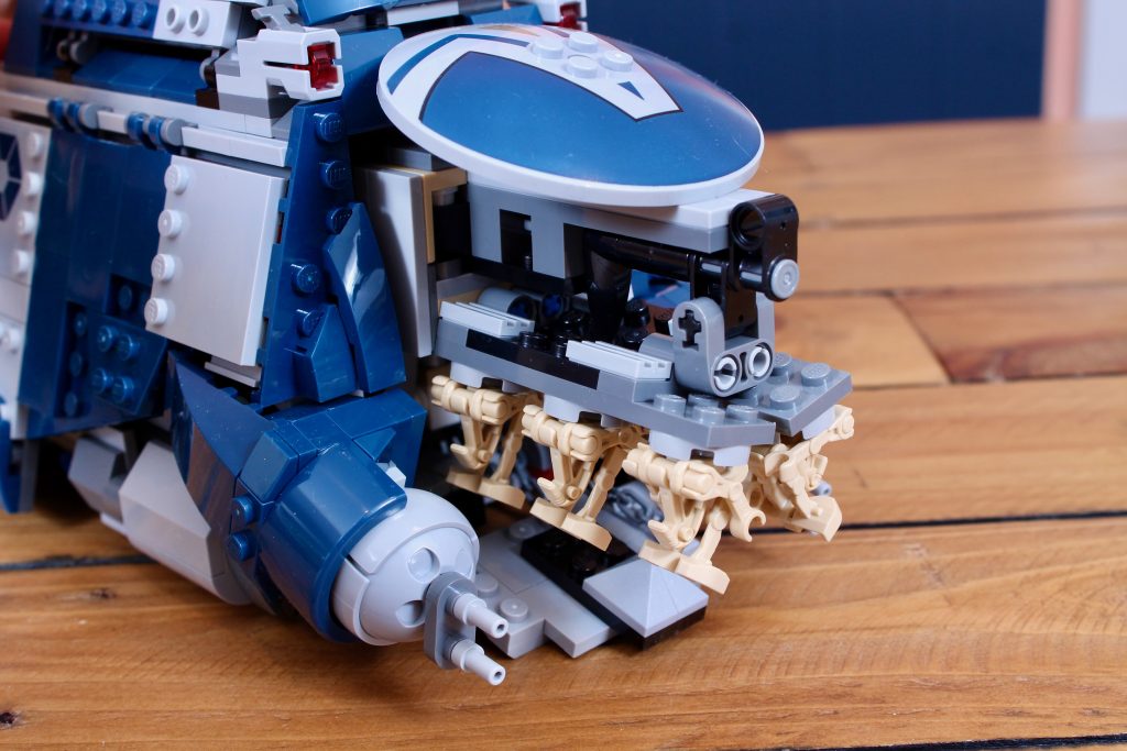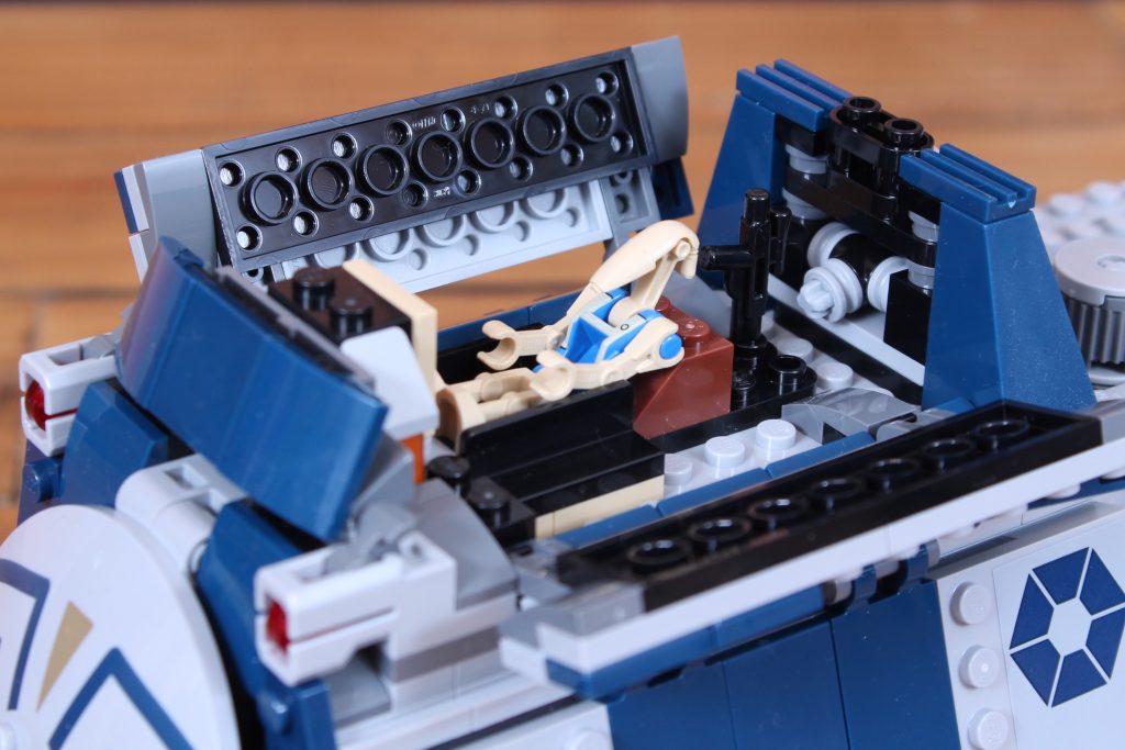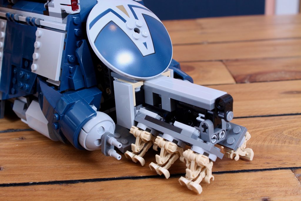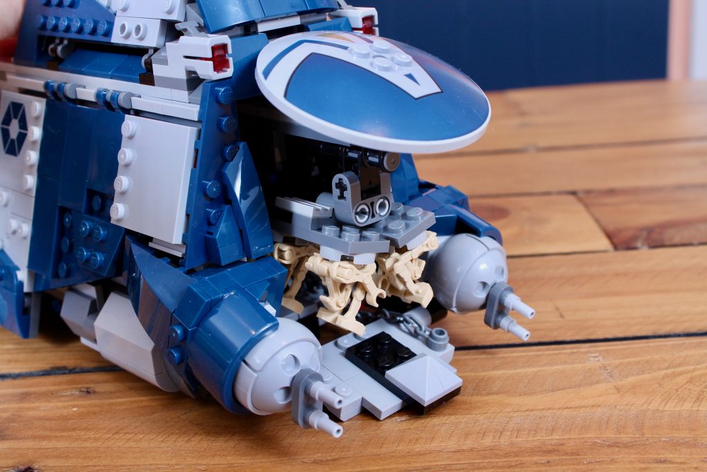 Mientras que en el set anterior el soporte simplemente se empujaba hacia adelante con los droides en posición vertical, aquí una manivela poco disimulada en la parte trasera del tanque empuja primero el soporte y luego lo baja al suelo, con los droides plegados y fijados con mayor precisión mediante sus pernos traseros. Es una auténtica mejora respecto a los mecanismos MTT anteriores y su manejo es muy satisfactorio, sobre todo porque se retrae con la misma facilidad (e incluso cierra automáticamente ambas escotillas delanteras gracias a una cadena bien colocada).