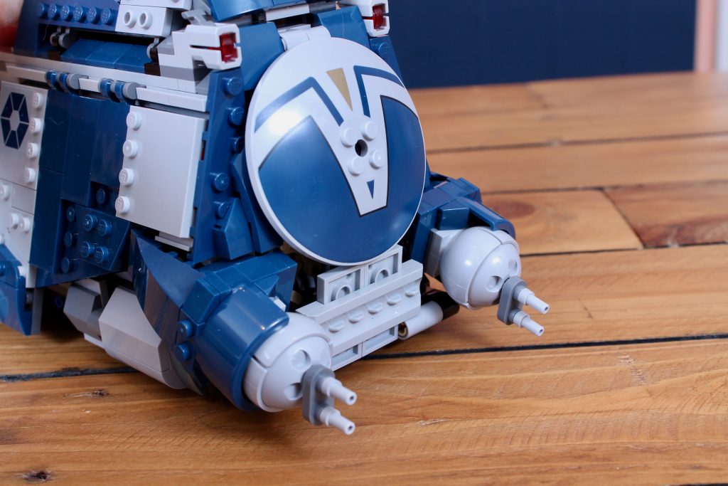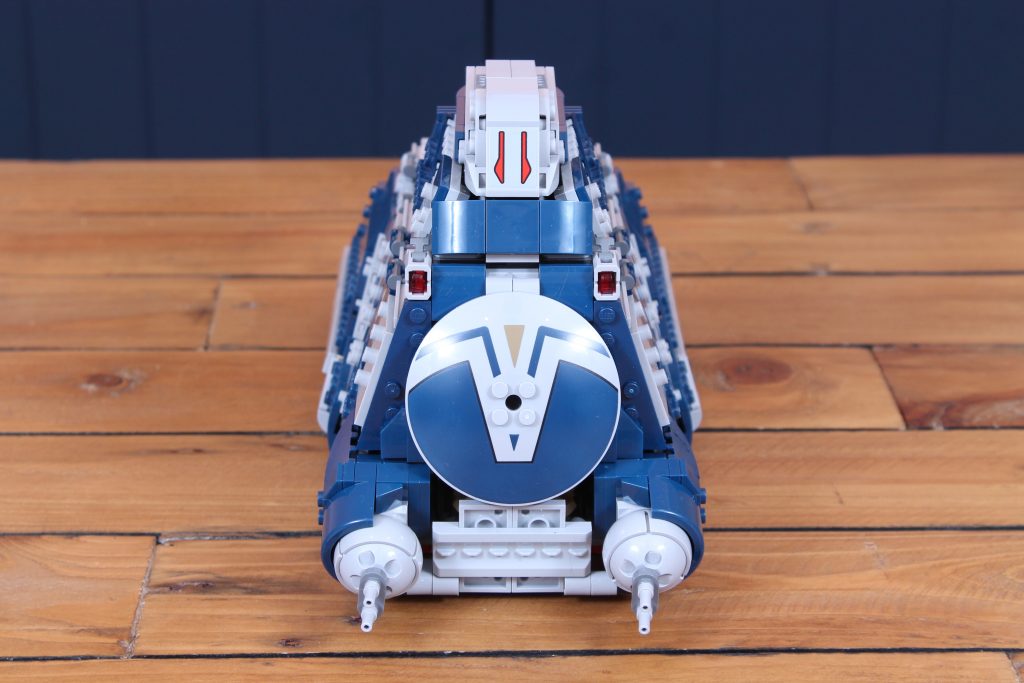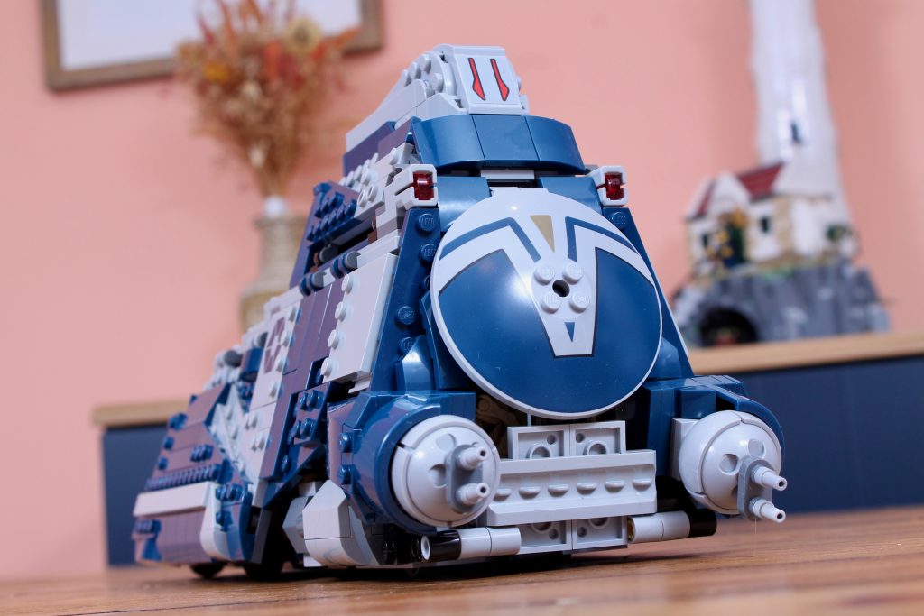El ensamblaje de ese mecanismo constituye la mayor parte de las primeras etapas de la construcción, ya que ocupa la mayor parte del interior del Transporte Multitropa. Es más interesante que las etapas posteriores, que consisten principalmente en construir los paneles que forman el armazón del tanque, pero experimentar con una paleta de colores azul oscuro y gris claro sigue siendo más divertido que el marrón tradicional de los Transporte Multitropa de la Federación de Comercio.