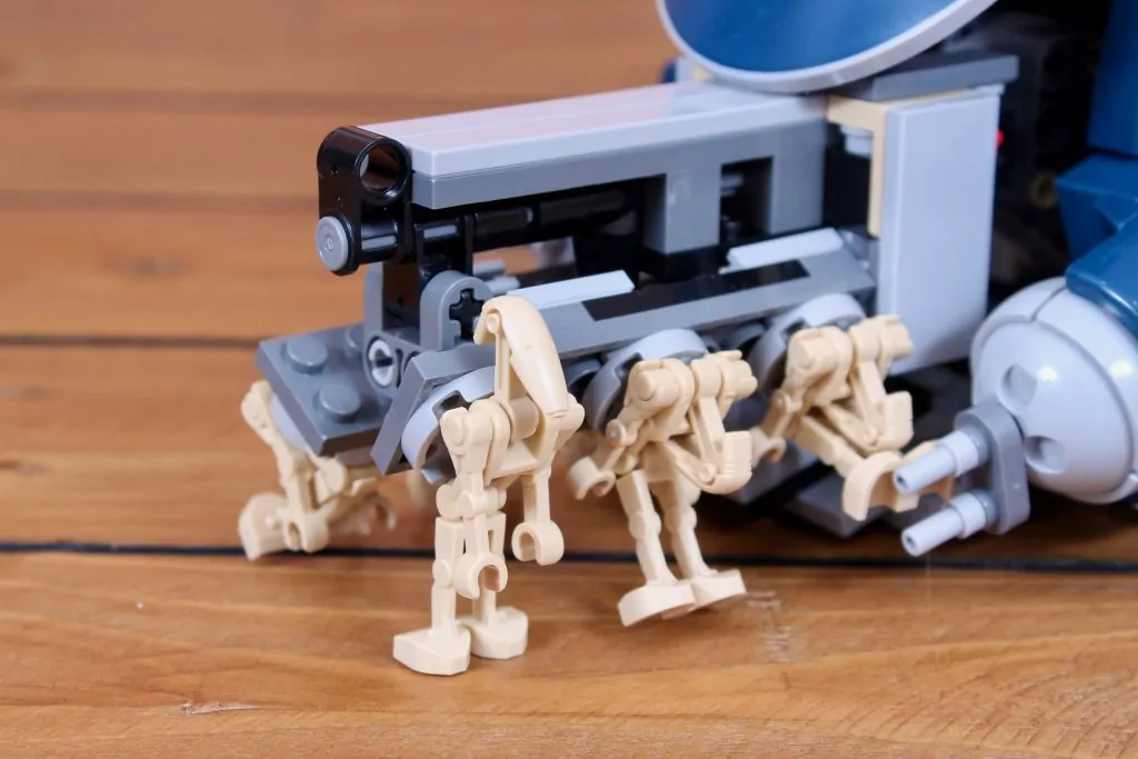 En este caso, son seis, al menos en la caja, aunque al agruparlos más a ambos lados, esa cantidad puede aumentar instantáneamente a ocho. La razón por la que no se incluyó de serie solo se debe a razones presupuestarias (más información próximamente). Esa es la misma cantidad de droides que cabían en la versión de 2014, solo que aquí el mecanismo para liberarlos del tanque es mucho más complejo.
