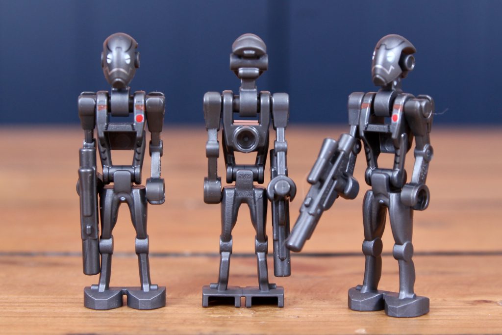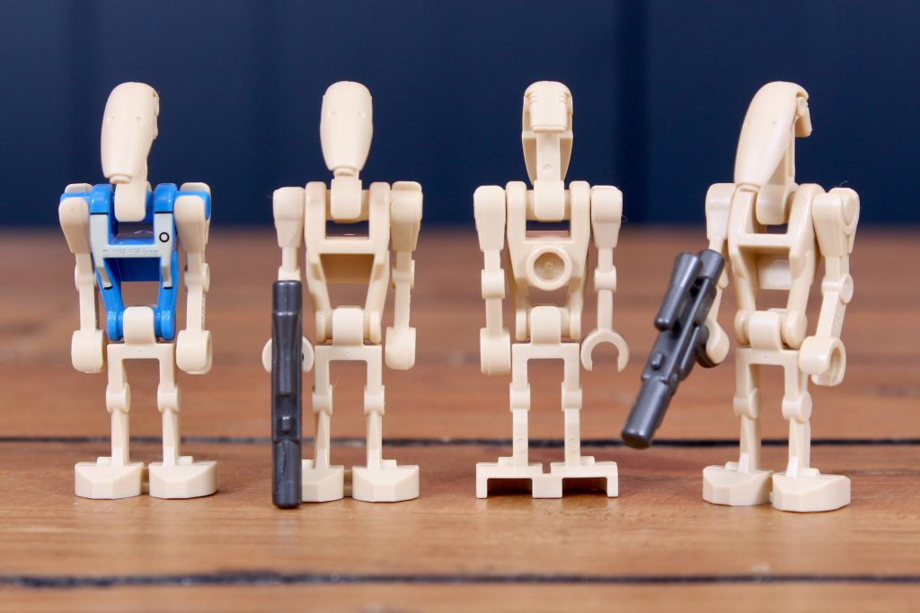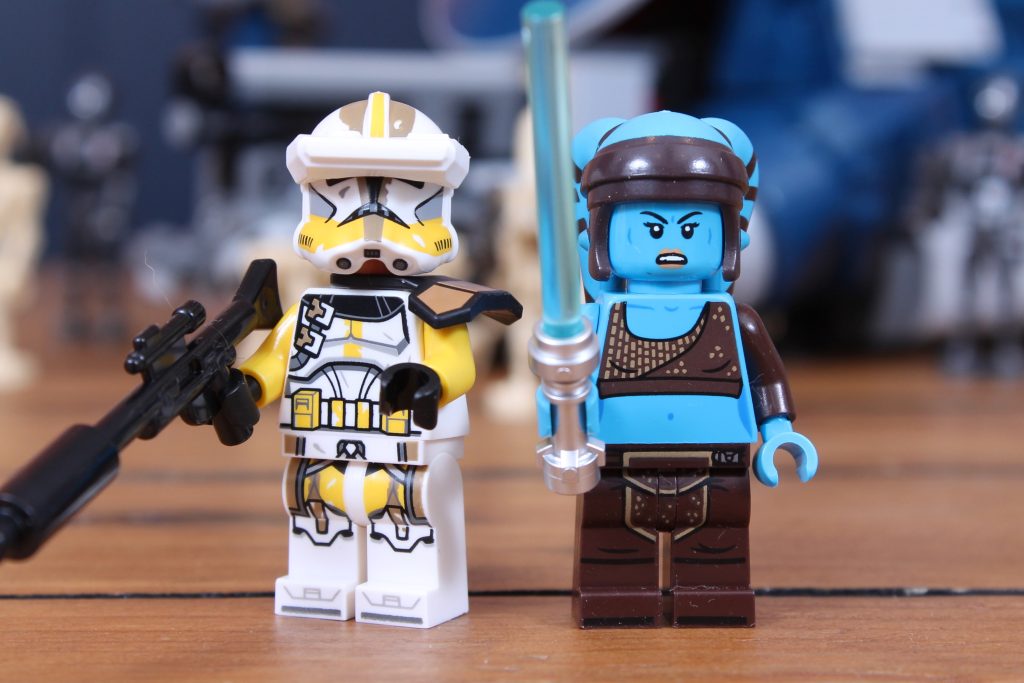 Estrictamente hablando 75435 Batalla de Felucia MTT Separatista En realidad, solo incluye dos minifiguras estándar: Aayla Secura y el Comandante Bly. Seis B1 estándar, un piloto de droide de combate y tres droides comando (que regresan por primera vez en mucho tiempo, ahora en gris oscuro perla en lugar de marrón) conforman el resto, lo cual es lógico para un vehículo separatista.