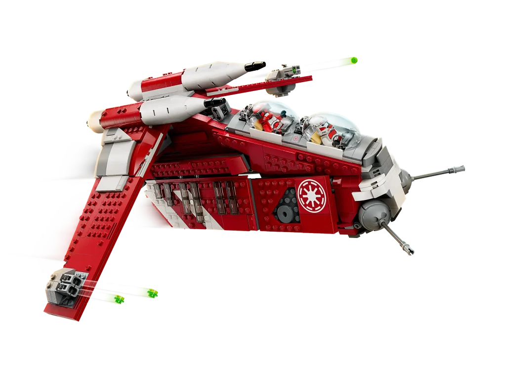 El color y la forma son bastante precisos, y las proporciones de las alas con respecto al cuerpo se mantienen fieles a la versión en pantalla. Además, el color rojo que lo distingue de una cañonera de la República estándar se mantiene fiel, con el logotipo blanco de la Guardia de Coruscant estampado en la nariz de la nave. Los lanzamisiles rojos y blancos en la parte superior están completamente equipados en el programa, como lo están en la construcción, junto con torretas láser montadas en las alas.