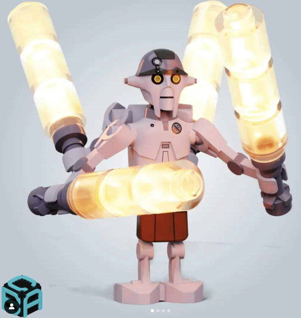 Vimos una minifigura personalizada de Huyang que se parece mucho más a la versión en pantalla, hecha por ladrillos3d. La costumbre creador Se han utilizado piezas de diseño de droides especiales en un color similar al del cuerpo de Huyang en acción real. También se ha eliminado la impresión del torso para revelar más fielmente el símbolo del pecho de Huyang, en lugar del conjunto de cables impreso en la minifigura oficial.